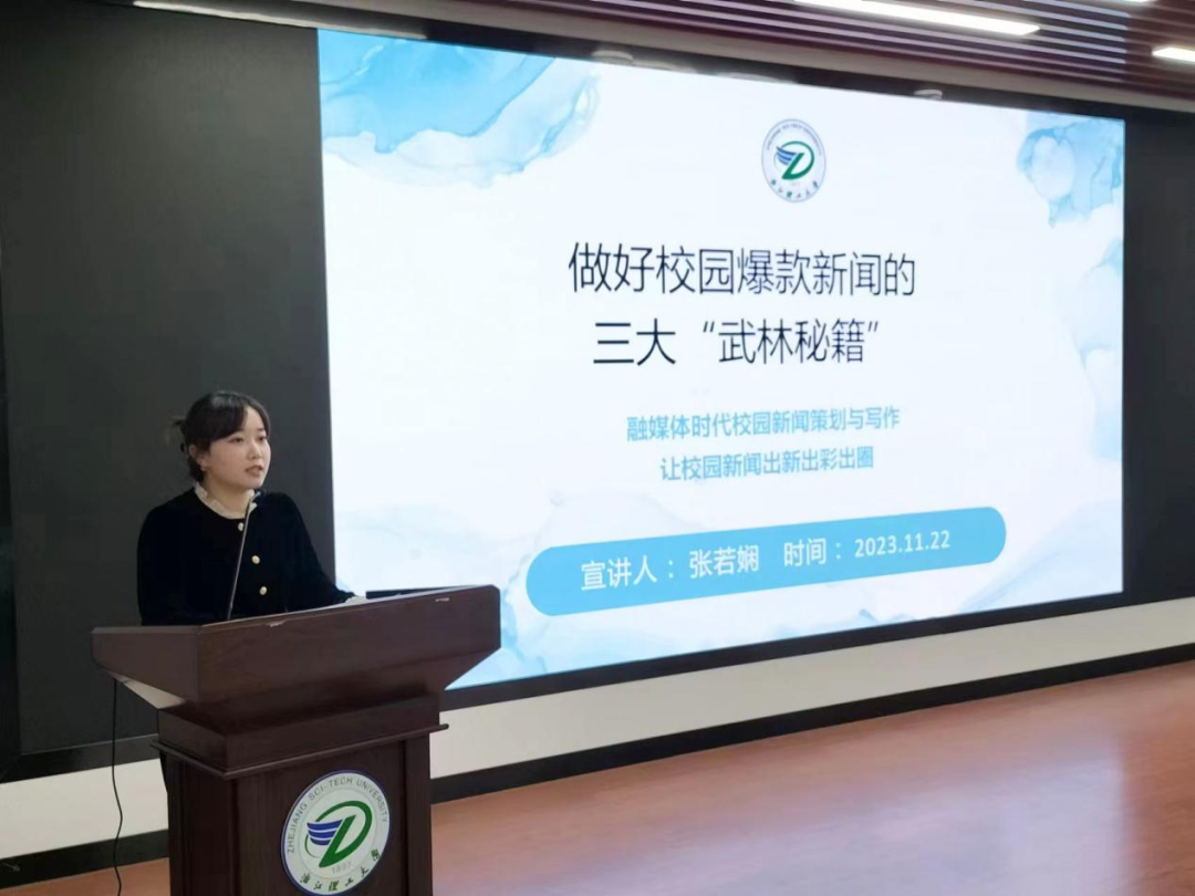 开班仪式后,党委宣传部新闻宣传科张若娴老师作了《做好校园爆款新闻的三大“武林秘籍”》专题培训。张老师通过讲解融媒体时代校园新闻策划与写作的方法与技巧来提升学生干部的沟通交流能力。