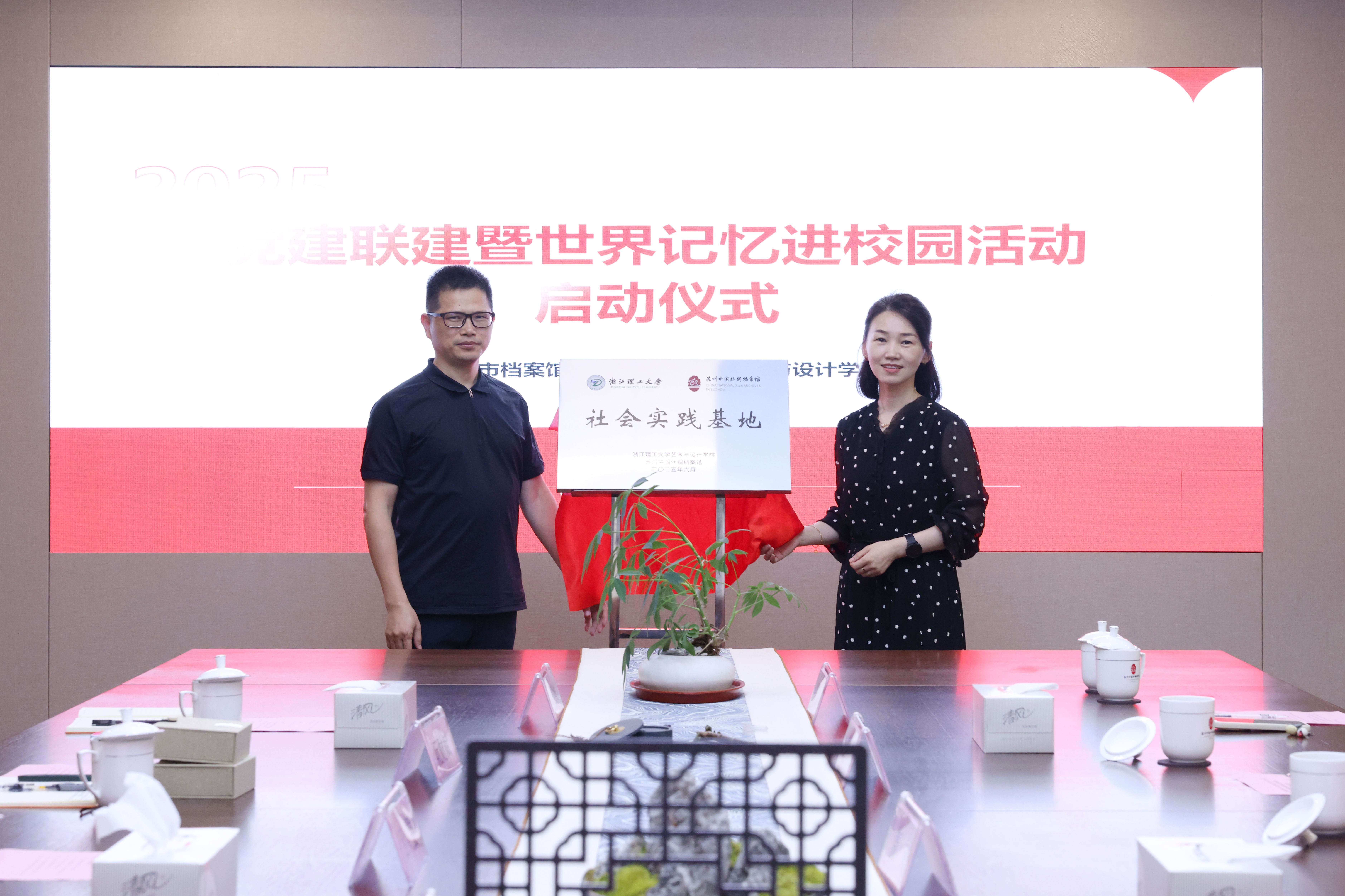 据悉,2017年苏州中国丝绸档案馆的29592卷近现代中国苏州丝绸档案成功入选“世界记忆名录”,目前我国仅入选18项。为了传承和发扬丝绸档案的育人功能,学院将组建社会实践团队,双方将围绕世界记忆进校园活动,共同推进方案设计、项目开发和实践落地。阮财斌和谢静共同为社会实践基地揭牌,并宣布世界记忆进校园活动启动。