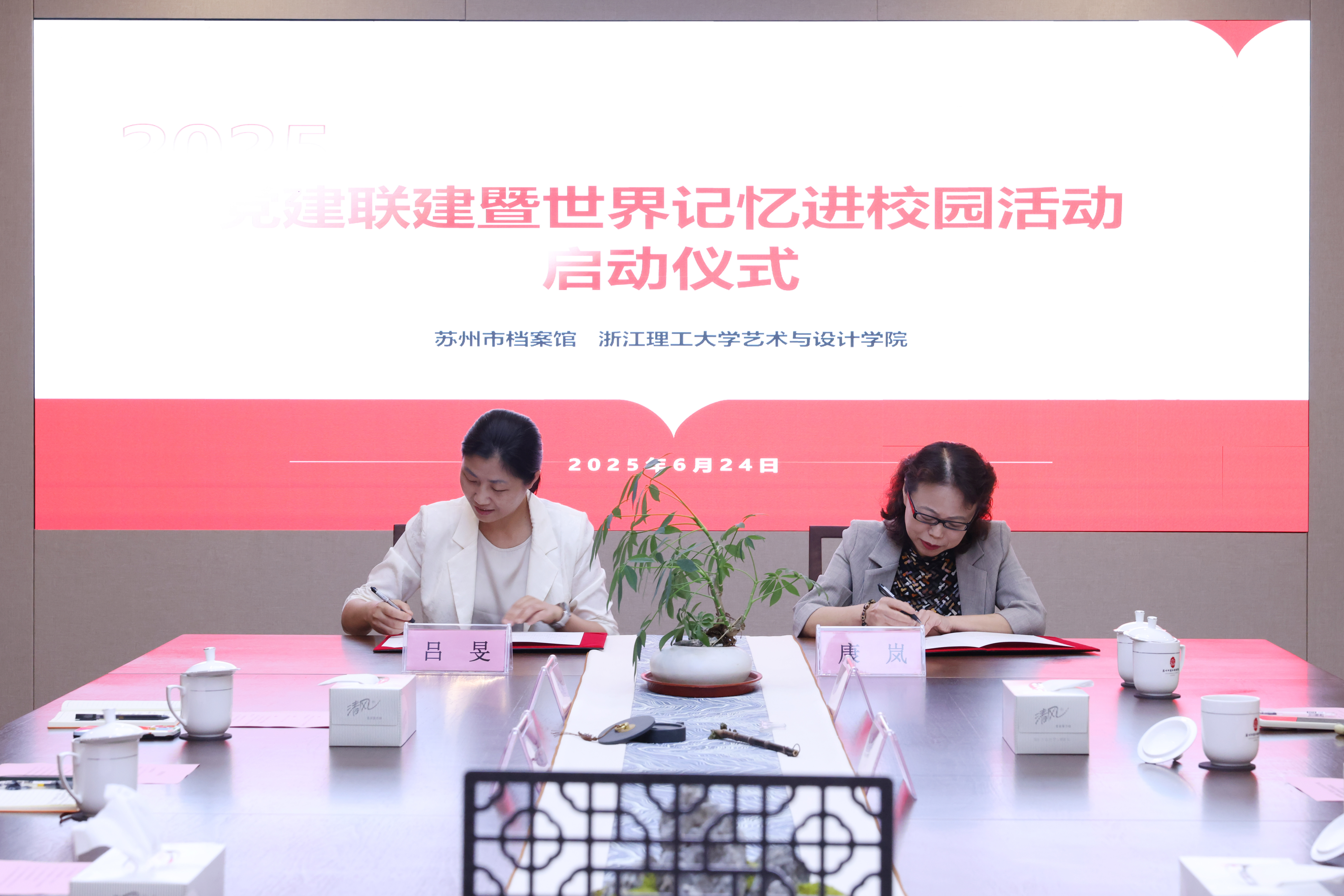 为庆祝中国共产党成立104周年,深入学习贯彻习近平新时代中国特色社会主义思想,加强党建引领,深化校馆合作,6月24日,c7网页版艺术与设计学院与苏州市档案馆举行党建联建暨世界记忆进校园活动启动仪式。苏州市档案馆馆长康岚,苏州市档案馆副馆长、机关党委书记贾莉,苏州市档案馆机关党委副书记周济,c7网页版艺术与设计学院党委书记吕旻,党委副书记阮财斌,党委委员高宁,专职组织员赵伟楠,团委副书记陈妍吉等参加活动。仪式由苏州市档案馆副馆长、苏州中国丝绸档案馆馆长谢静主持。