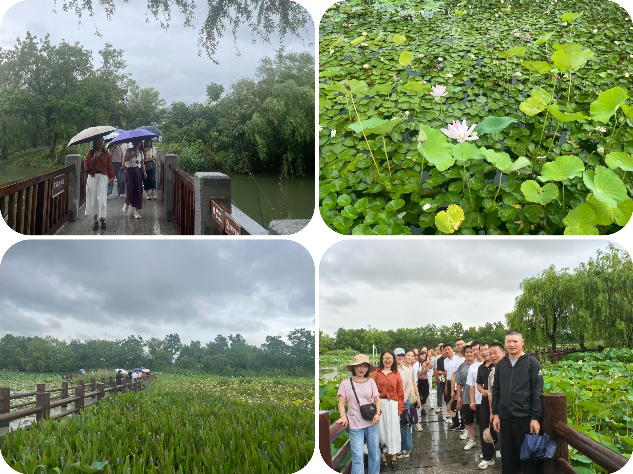 在水系发达的湖州,园林湿地遍布,别有一番韵味。首屈一指的园林是楷书四大家之一赵孟頫所建的莲花庄,莲花庄内有白萍春晓、云影清音、松泉印月、鸥波荷香等十景,各类莲花的绝美风姿在园中尽显,令人沉醉。与秀美的莲花庄形成反差的是太湖图影生态湿地文化园,文化园是典型的湖泊型湿地与太湖联通,水质清澈,湖面宽广,老师们坐上生态游览观光船,在细雨蒙蒙中荡舟湖上,行走在芦苇丛和荷花池中,洗去一身疲惫,让人流连忘返。