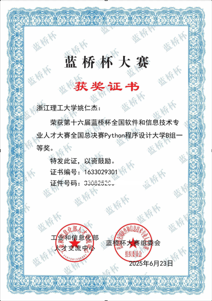 今年的决赛竞争尤为激烈,参赛选手们在复杂的算法设计、程序优化以及实际问题解决等多个环节展开激烈角逐。经过省赛的角逐,学校共有13名学生取得浙江省一等奖,并进入全国决赛。姚仁杰在比赛中冷静思考、精准作答,以清晰的逻辑和高效的代码实现脱颖而出,以全国第一名的成绩获B组Python组的第一名。任麒源、汪明获C/C++组国赛一等奖,余首荣、贺宇昊、胡涛、谢东、袁尤安、丁晨曦获国赛C/C++二等奖,华天豪、吴嘉豪、张浩获国赛C/C++组三等奖。
