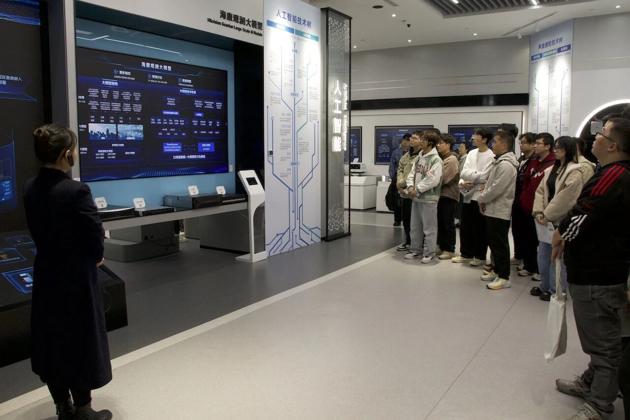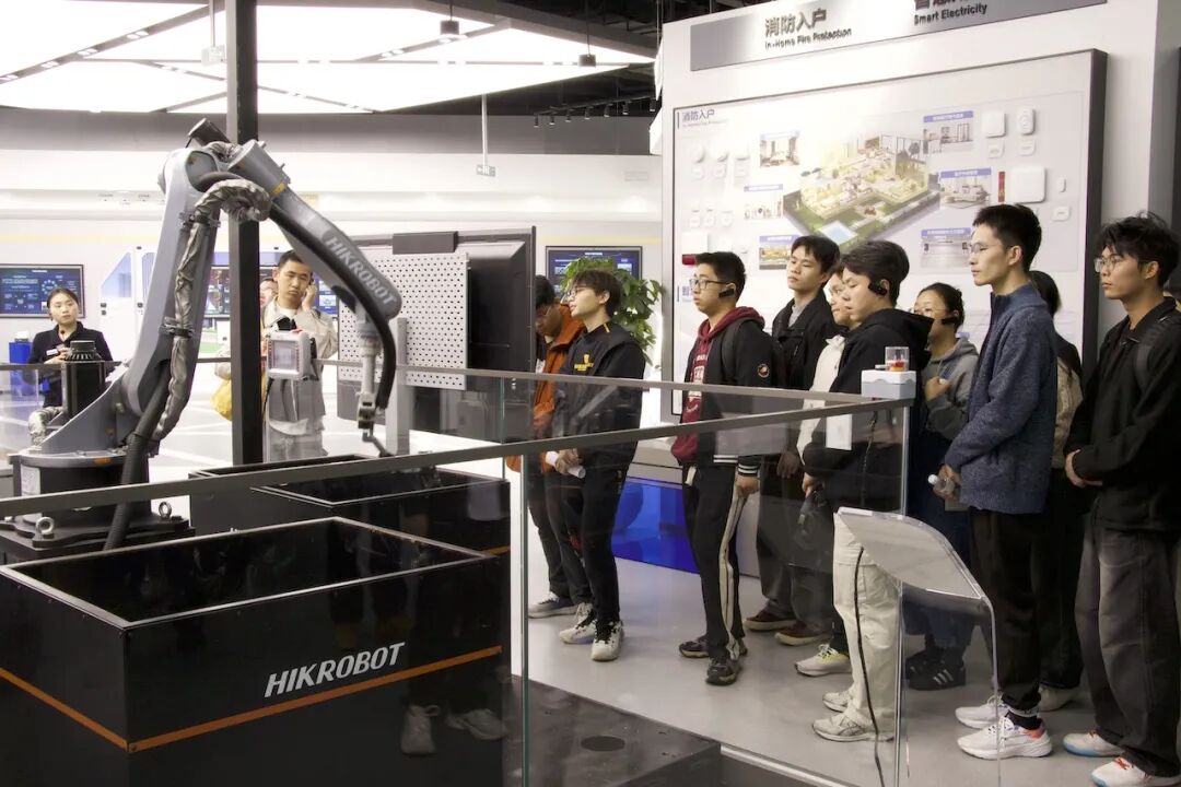 活动伊始,同学们在海康威视三期园区展厅进行了参观。展厅内集中展示了海康在智能物联领域的最前沿技术、产品与解决方案。从精密的机器视觉设备到灵活的移动机器人,同学们亲身感受到了科技为工业制造、社会生活带来的深刻变革,对行业发展趋势和未来工作场景有了更为直观和深刻的认识,充分感受了海康作为全球领先智能制造服务商的技术实力与行业影响力。同学们通过近距离观察工业机器人的精准运作,聆听技术人员的专业讲解,深刻感受人工智能与制造业深度融合的发展脉搏。