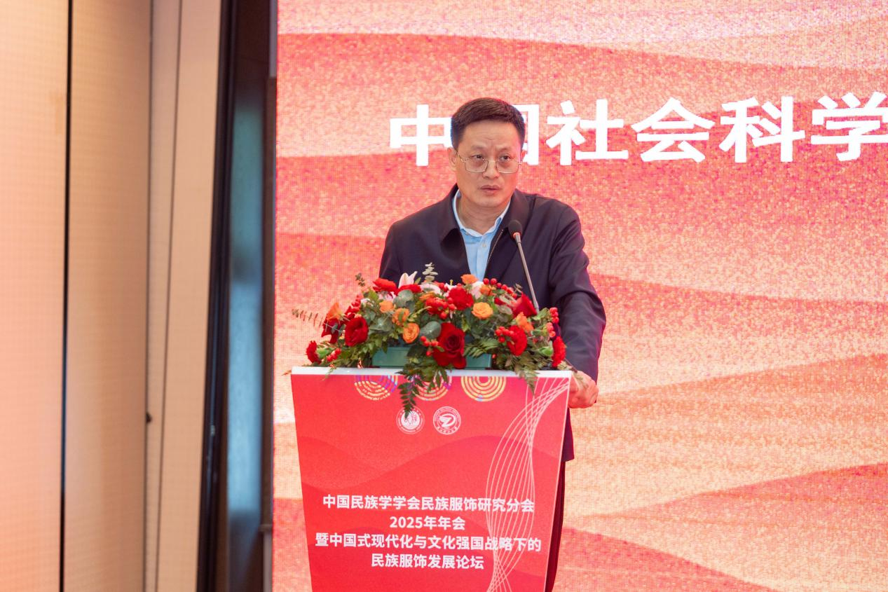 崔荣荣代表承办方致辞,他介绍了学校及服装学院在民族服饰研究与人才培养领域的深厚积淀。他表示,此次年会搭建“产学研用”协同平台,精准契合中国式现代化与文化强国战略下民族服饰文化传承创新的时代命题,学校将以此次活动为契机深化多方合作,推动学术研究与成果转化,为民族服饰文化建设贡献浙理工力量。