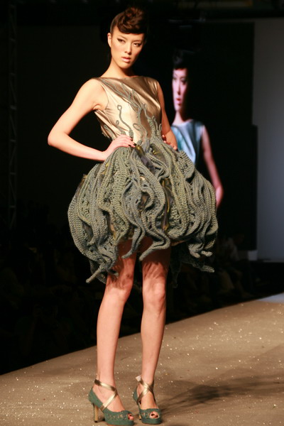 朵朵花开淡墨痕,我校学生沈口淑的作品《花开无痕》以水墨黑灰为主要色调,采用羽毛、蕾丝、真丝面料等流行元素组合成有序的花簇,很是华贵;绿意流云动似水,赖倩倩的作品《绿意萌生》灵感来自于豆角,结合绿色环保的理念和现代流行服装的设计,以线条来延伸豆子的萌发,给人想象的空间;飘逸灵动显曼妙,朱筱菲的作品《星宇心语》的灵感来源于海底的水母,运用白色的真丝面料,采用折纸工艺形成“蜂窝”效果,神秘且精彩。