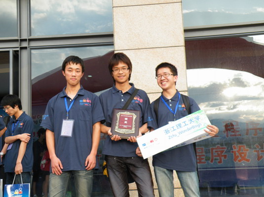 我校获得另外一枚银牌的是由机械学院王耀同学、信电学院骆立康和周碧漳同学组成的Zstu_WonderBoys队。由信电学院陈文文同学、启新学院方贤忠同学、机械学院肖四维同学组成的zstu_SunUp队和信电学院徐俊、龚洪杰、林德安同学组成的Zstu_zerOne队则分别摘取了铜牌。