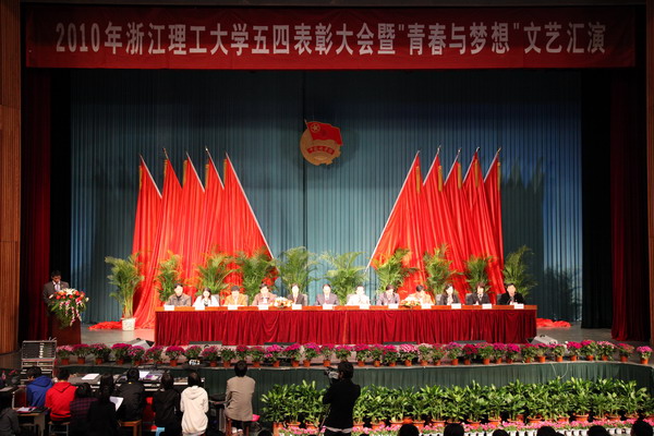 4月29日晚,我校2010年五四表彰大会暨文艺汇演在会展中心大剧院举行。校党委书记费君清,校长裘松良,党委副书记金瑾如、程刚,副校长陈建勇,校长助理朱根弟,以及有关职能部门负责人和各学院党总支书记出席大会。