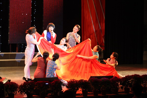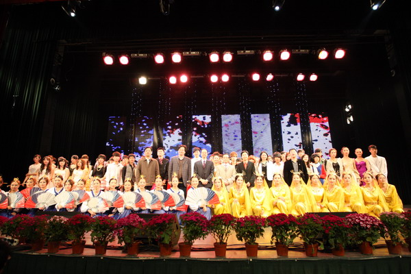 由校大学生艺术团和各学院选送的16个节目形式多样、内容新颖,充分展示了我校青年学生的青春风采和壮志豪情。演出现场,校大学生艺术团表演的歌曲《绣红旗》、群舞《扇骨》、民乐联奏《春江花月夜》,材纺学院选送的舞台剧《那年的五四年华》,文传学院选送的诗朗诵《春天,遂想起》,启新学院和机械学院选送的武术表演《卧虎藏龙》,外国留学生表演的歌舞《世界你我他》等精彩节目赢得了现场观众的阵阵掌声。演出结束后,在场领导上台亲切慰问演职人员,并与全体演职人员合影留念。