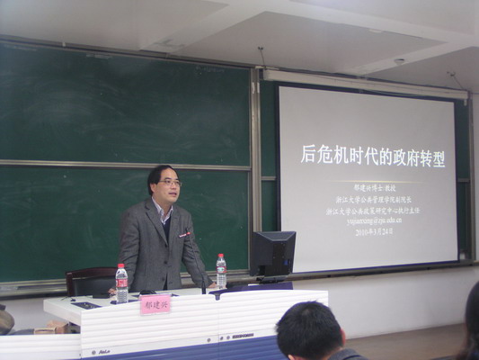 聘任仪式结束后,郁建兴做了题为“后危机时代的政府转型”的精彩报告。报告主要分三部分。郁建兴首先从今年两会上温家宝总理作的政府工作报告分析入手,并结合近年来我国经济社会转型背景和当前中国经济发展模式的分析,提出了经济结构的转型关键在于政府转型这一命题。接着他指出政府转型要超越政府大小之争的抽象讨论,其实质是实现从发展型政府向公共服务型政府的转型。郁建兴通过对发展型政府和服务型政府概念的比较,并从正反两方面进一步明确了服务型政府的内涵。最后,郁建兴提出服务型政府的关键是要完善公共财政体制、创新政府职能履行方式和创新政府管理体制等。