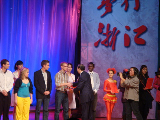 本次系列活动由浙江省教育厅、省政府新闻办、省外办、省广电集团联合主办。活动以“我和浙江”为主题,吸引了全省20多所高校外国留学生的热情参与。在我校党委宣传部、校团委、文化传播学院、服装学院和留学生处的紧密协作和我校广大留学生的积极参与下,我校共选送了1部DV作品和12幅摄影作品参加系列活动中的DV展和摄影大赛。我校留学生带着经过一个多月精心准备的歌舞节目《世界你我他》也参加了颁奖典礼的文艺汇演活动,来自美国、日本、韩国和刚果(金)的9名留学生以他们优美的歌声和热情的舞蹈给在场中外观众留下了深刻的印象,博得了全场一次次热烈的掌声和欢呼声,尽情展现了我校留学生的风采。