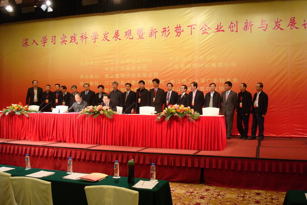 论坛举行期间,我校与84届机械专业校友石志清创办的企业——佛山盛迪纺织有限公司就建立c7网页版产学研合作基地事宜举行了签约仪式,裘松良为产学研合作基地揭牌。