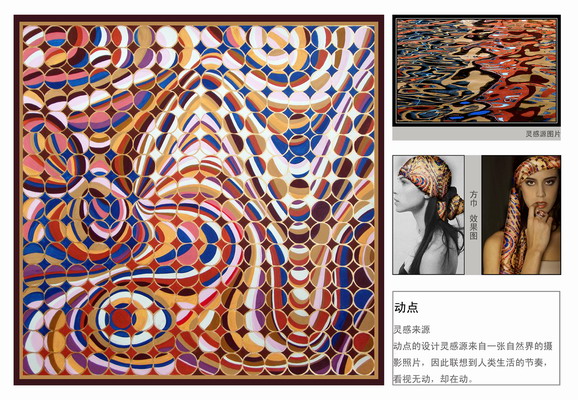 《动点》的设计灵感源来自于一张自然界的照片。在创作过程中,作者紧紧围绕大赛“流动的旋律”主题,抓住色彩和面料的流行趋势进行设计。他通过色彩与色彩之间的关系,充分发挥想象力,把人类暗喻为穿梭在圆点中的小色块,结合人类生活的快节奏和慢状态,把色块进行有机的分割和结合,从而产生了看似不动、实而在动的流动之韵。指导老师林竟路说:“作品《动点》结合流行趋势,把时尚元素与人类生活相融合,注重色彩之间的和谐,达到了各元素之间的协调与统一,具有文化底蕴。”