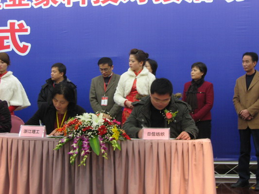 在科技合作签约仪式上,我校邵建中教授代表课题组与义乌日信纺织有限公司签署了“高品质涂层纺织品的关键技术研发”项目合作协议书。在百名专家与千名企业家科技对接活动期间,我校设专区展示了纺织、机电、材料等专业的最新科研成果,与多家企业达成了合作意向。