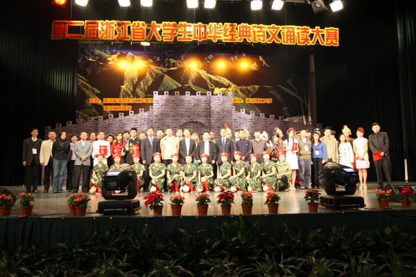 11日下午,第二届浙江省大学生中华经典诗文诵读大赛(决赛)在我校国际会展中心大剧院隆重举行。省教育厅副厅长韩平,团省委副书记苗伟伦,省委宣传部新闻出版处副处长赵刚,省公务员局综合处处长倪建海,省广播电影电视局人事教育处处长严卫平,团省委少年部部长劳虓虓,省语委办公室主任、省教育厅语管处处长李建章,中国教育报浙江记者站站长朱振岳等及校党委书记费君清、校党委副书记程刚、副校长陈建勇等领导出席大赛并为获奖选手颁奖。