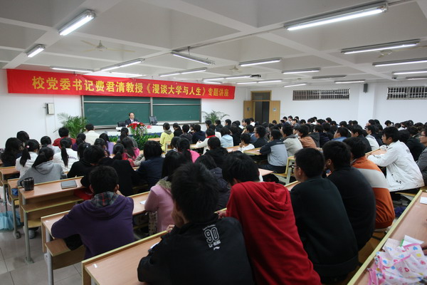 讲座中,费君清送给大学生们四点建议。一是要志存高远。“如何立志”是踏入大学校园的第一个重要命题,就好比围棋中的布局,只有定好位、布好局,树立远大的志向,追求高尚的品位,才能实现完美人生。二是要勤奋学习。打虎趁少年,玩物则丧志。青年大学生记忆力好,学知识好比石上刻字;而中年人学习,却好比以斧劈水。大学生要抓住最佳的学习时期。三是要注重身心健康。无体,则志、德无伴可附。大学生要阳光开朗、理智通达。四是要培养能力。大学生活丰富多彩,是培养能力的最佳场所;大学生们天真无邪,是人生最值得结交的朋友和重要的人脉。