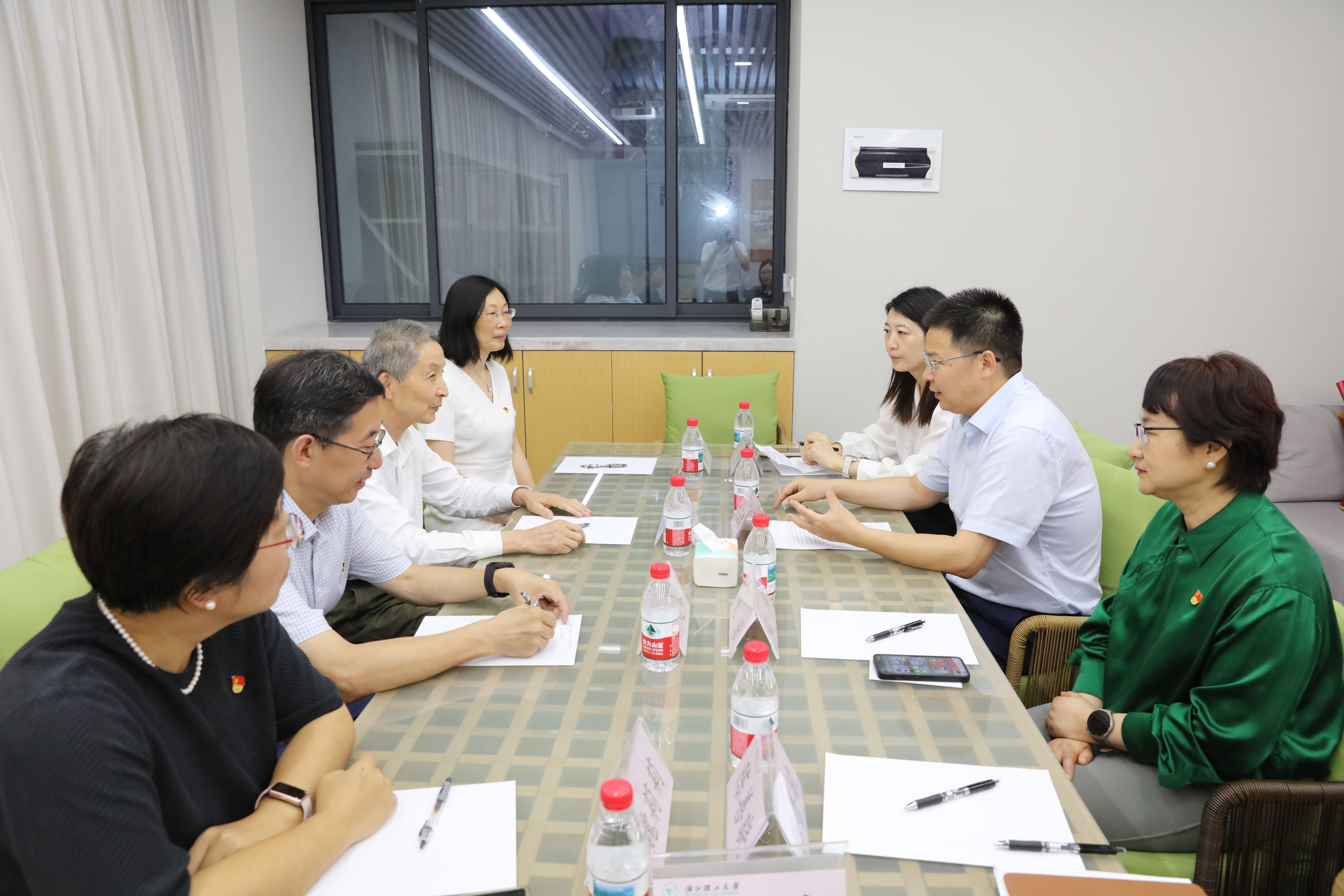 在纺织科学与工程学院(国际丝绸学院),赵书记亲切慰问了全省高校优秀共产党员吴金丹,并同学院党委班子成员座谈交流。他表示,纺织服装产业是浙江传统优势产业,产业规模已超万亿元。学院作为全省党建工作标杆院系,要以高质量党建引领学院事业高质量发展,通过强化政治引领、优化组织动员、深化价值认同,突出重点、找准定位、精准发力,系统性将组织优势转化为推动“纺织强国”建设的发展胜势,为加快推动纺织产业转型升级贡献力量。