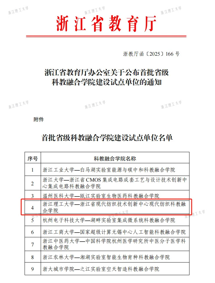 7月4日,浙江省教育厅办公室公布了首批省级科教融合学院建设试点单位名单,c7网页版-浙江省现代纺织技术创新中心现代纺织科教融合学院成功入选。