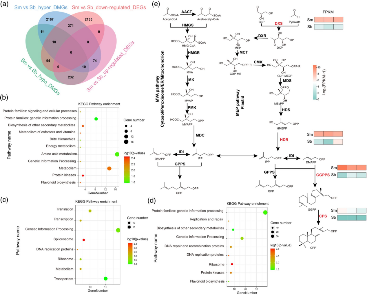 团队研究发现,丹参中丹参酮含量显著高于南丹参,尤其是丹参酮Ⅰ和丹参酮ⅡA的含量分别为南丹参的2.55倍和5.07倍。通过全基因组甲基化测序(WGBS)和转录组分析,研究团队发现丹参整体DNA甲基化水平高于南丹参,尤其是在CHG和CHH序列背景下。这一差异与甲基转移酶基因(如 DRM1、DDM1、CMT1、CMT3)的高表达以及去甲基化酶基因 ROS1 的低表达密切相关。进一步分析表明,丹参酮合成通路中的关键基因(如DXS1、GGPPS2、HDR2、CPS3)在其启动子或基因体区域的甲基化水平与基因表达呈显著相关性。启动子低甲基化或基因体高甲基化可能促进这些基因的高表达,从而促进丹参酮的合成与积累。