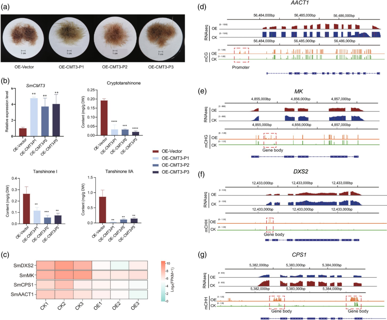 为验证这一机制,研究团队在丹参毛状根中过表达了SmCMT3基因,结果显示丹参酮类成分(隐丹参酮、丹参酮Ⅰ、丹参酮ⅡA)的含量显著下降,同时多个丹参酮合成关键基因(如 SmMK、SmCPS1、SmDXS2、SmAACT1)的表达水平下调,其启动子或基因体区域的甲基化水平也发生相应变化。