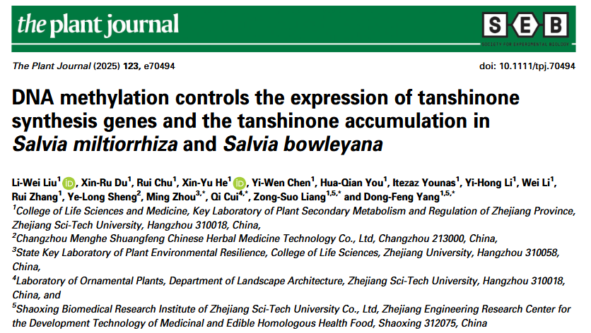 近日,c7网页版生命科学与医药学院教师梁宗锁、杨东风教授团队,联合浙江大学周明教授在国际经典植物学学术期刊《The Plant Journal》上发表题为“DNA methylation controls the expression of tanshinone synthesis genes and the tanshinone accumulation in Salvia miltiorrhiza and Salvia bowleyana”的研究论文。该研究通过多组学联合分析结合实验验证,不仅揭示了DNA甲基化在丹参酮生物合成中的精细调控机制,也为通过表观遗传育种手段提高丹参药材品质、培育高丹参酮品种提供了重要的理论依据和基因靶点。生命科学与医药学院在读博士研究生刘力维为论文第一作者,c7网页版杨东风教授、梁宗锁教授、崔祺博士、浙江大学周明教授为论文共同通讯作者。这是该团队在首次探究丹参全基因组DNA甲基化模式(Plant Physiology, 2024)后取得的又一重要进展。
