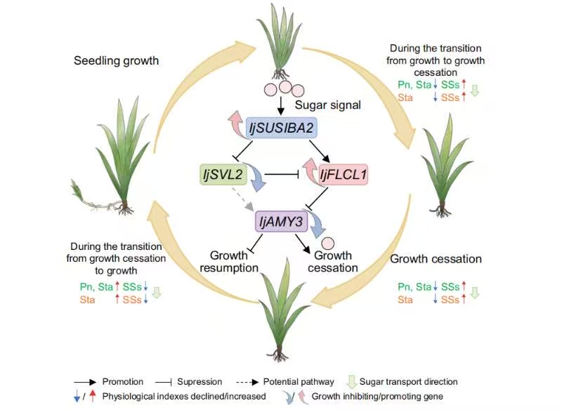 通过转录组分析,研究团队鉴定出多个与生长转换密切相关的MADS-box转录因子。同源瞬时基因功能验证表明,IjFLCL1在促进生长恢复中发挥核心作用,而其下游基因IjAMY3则通过调控淀粉降解从而抑制生长。同时,受糖信号诱导的转录因子IjSUSIBA2被证实能直接促进IjFLCL1,并抑制IjSVL2的表达,从而形成一个新的调控通路:IjSUSIBA2-IjSVL2-IjFLCL1-IjAMY3(图2)。