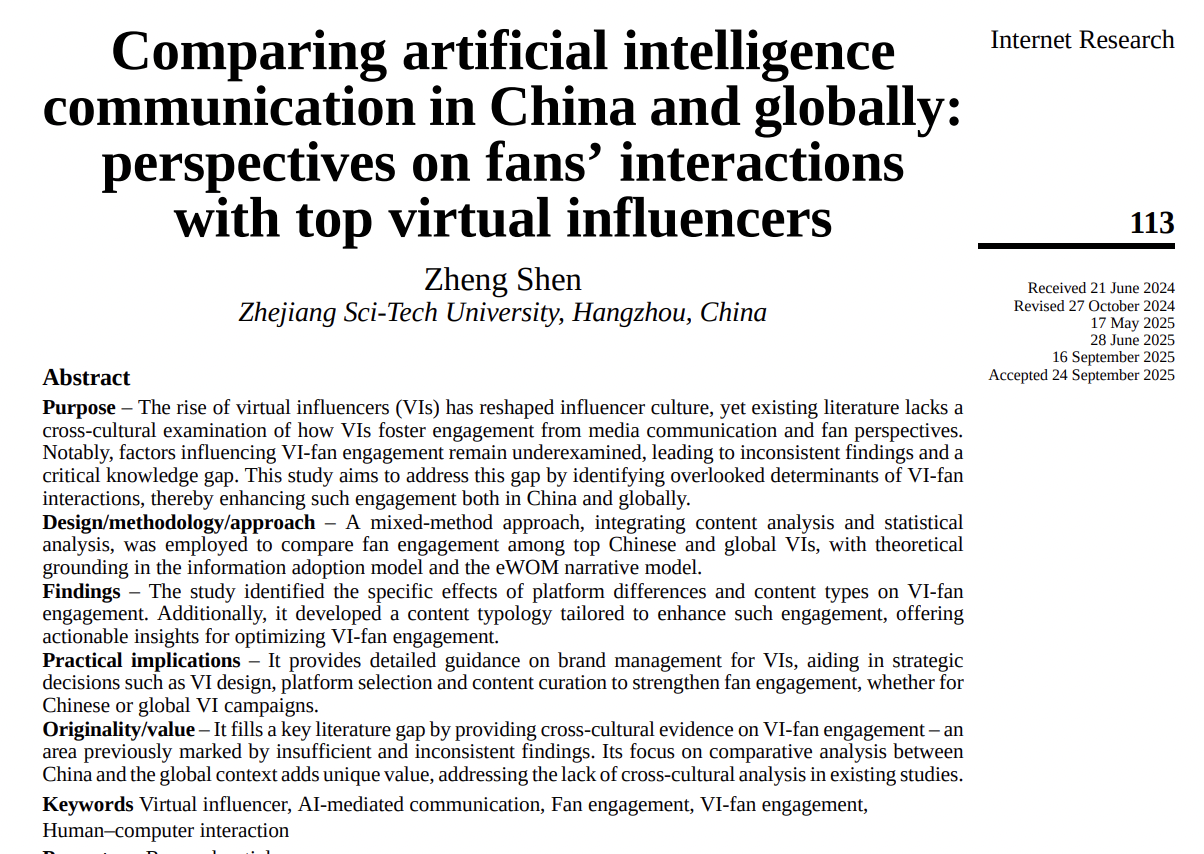 近日,我校法学与人文学院传播系特聘副教授沈郑在传播学与计算机信息系统领域国际顶尖期刊《Internet Research》2025年第7期上独立发表题目为“Comparing artificial intelligence communication in China and globally:Perspectives on fans’ interactions with top virtual influencers”的学术论文。